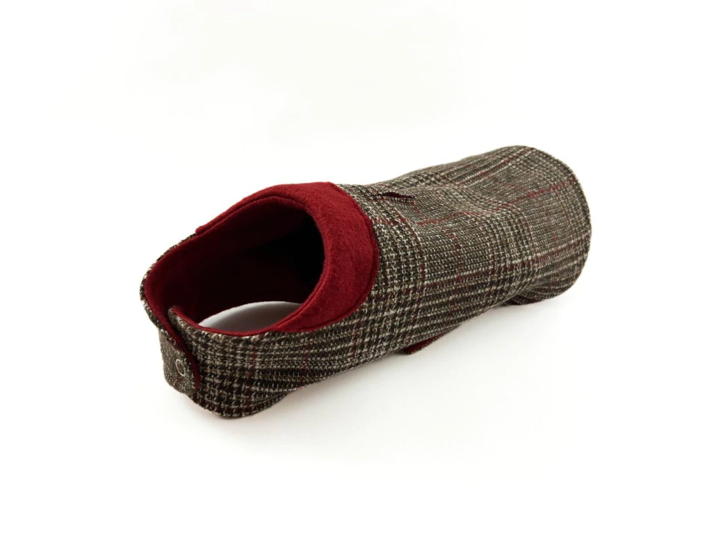 Feita em tecido xadrez Príncipe de Gales em poliéster na parte externa e forro em lã batida, proporciona estilo e calor.